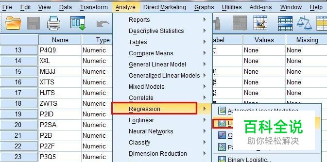 在spss中,打开线性回归的菜单,如图所示