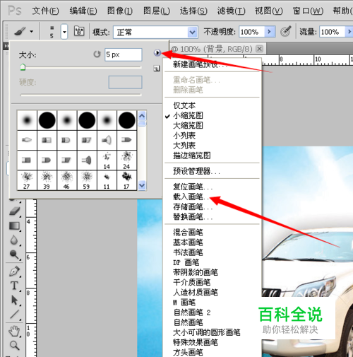 打开Ps,画笔工具,菜单栏,画笔右侧的小三角,再点击画笔右侧小三角,选择载入画笔