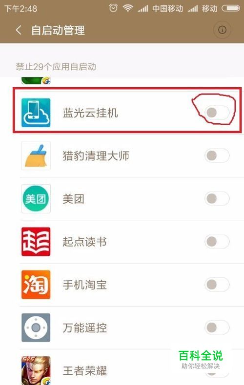 有些手机在下载一些软件后总会自动设置成开机自启动,那么如何去关闭这些程序的自启动呢,下面就以蓝光云挂机为例来演示一下要如何关闭