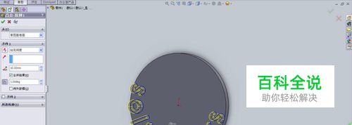 在操作栏内选择文本要依附的位置,下面选中的边线<1>就是指模型前平面的圆周