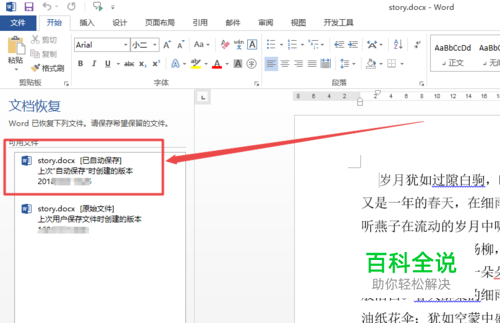 然后在任务管理器中将这个Word的任务结束掉,也就是直接不保存就退出,然后再次找到刚才不保存就退出的Word文件,打开它,可以发现它的左侧会弹出 文件恢复提示,然后点击需要恢复的文件,打开它,可以看到刚才插进来而没有保存的内容,已经自动保存了,也就可以恢复过了。