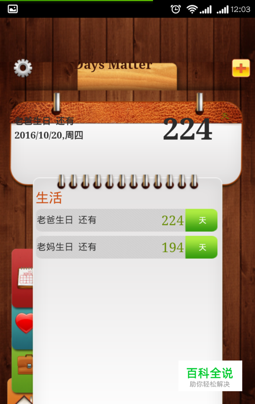 右上角有个黄色的加号,点开后就可以设置你想设置的日子。 你需要输入事件,例如: 父母的生日;和恋人在一起了多长时间;下一个工作日是什么时候等。