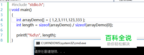 最后 附上代码 #include "stdio.h"; void main() { int arrayDemo[] = { 1,2,3,111,123,333 }; int length = sizeof(arrayDemo) / sizeof(arrayDemo[0]); printf("%d\n", length); } 运行结果如下: