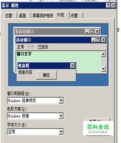 显示“高级外观”功能框,单击“项目”下方长条后面的黑色小三角,设置成“窗口”;再单击“颜色”下方的黑色小三角,再单击一下“其它”。