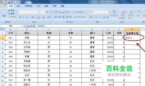 选中输入应发放工资的单元格,输入“=F2*G2”