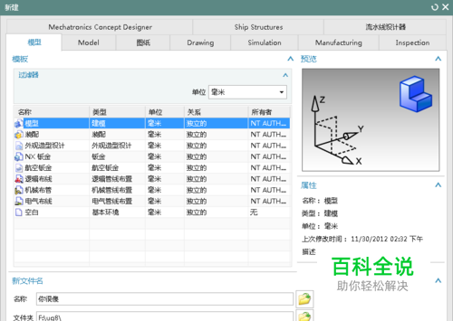 关闭ug当前的对话框,然后新建一个文件,进入加工木块。出现下图1. 在图2位子中点击 浏览设计不见后面的那个图标,出现一个对话框,找到你刚刚保存的那个文件双击就进入了