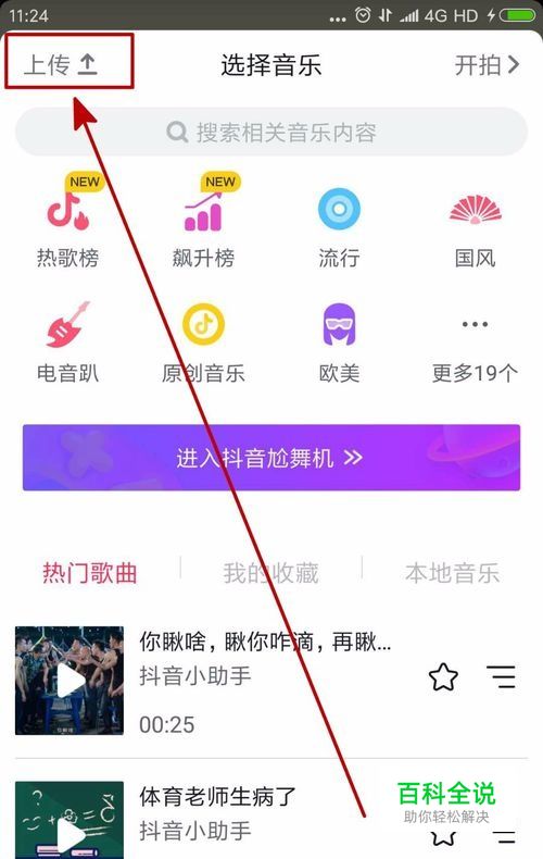 由于我们是之前自己拍摄的视频上传,所以这里不用选择音乐,直接点击左上角的上传。