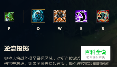 奥拉夫因为本身没有位移,所以在技能的掌控方面需要了如指掌才可以打败对手,下图为奥拉夫这个角色的技能说明,只有了解奥拉夫才可以玩好这个英雄;详情参考下图