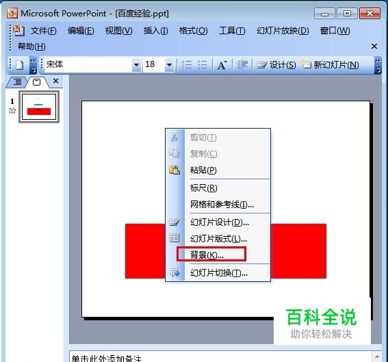 2.在PPT里右键空白处 然后点击“背景” 如图