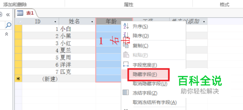 首先选中年龄这一整列【右击】,选择【隐藏字段】。