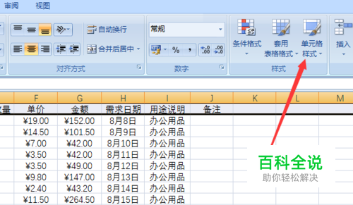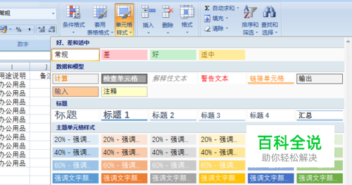 打开单元格样式栏,选择合适的样式。单击样式后,所在的单元格区域就被该样式应用。
