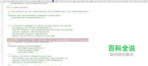 找到63行的 <Connector connectionTimeout="20000" port="8080" protocol="HTTP/1.1" redirectPort="8443"/>这句话 假如找不到,可以搜索8080等关键性词语