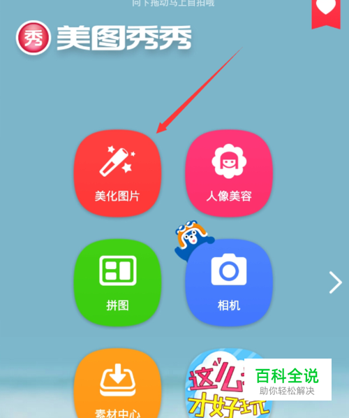 打开手机中的美图秀秀APP,然后在出现的美图界面点击“美化图片”,如图