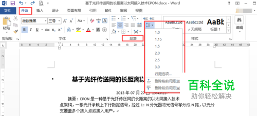 打开word文档, 选中全篇文档,切换到【开始】选项卡,在【段落】组中单击【行和段落同距】按钮 ,在弹出的下拉列中选择【1.15】选项,随即行距变成了1.15倍的行距。