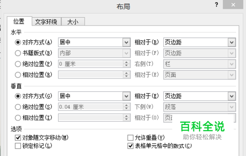 在布局窗口上方,选择文字环绕,选择四周型。 再重新点击位置,此时的水平,垂直对齐方式就可以更改了。 按照题目要求,将二者都设置为“居中”,相对于页边距。