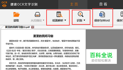 ocr文字识别软件的使用方法: 打开pdf文件——纸面解析——识别——保存为word。