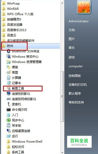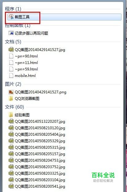 开始栏中找到【截图】,可以直接在开始中的搜素框里输入【截图】,如图1所示,也可以用传统的方法,找到【附件】,在附件里找到【截图】。