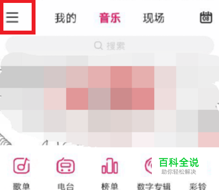 起先进入‘咪咕音乐’的初阶页面后,在最左角有三道灰杠,看到并指按这里。