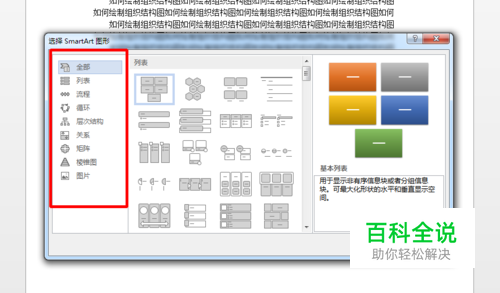 在弹出的“选择SmartArt图形”对话框中选取一个合适的、需要的结构形状。下面是所有的列表,接下来解释一下如何选择合适的结构图。