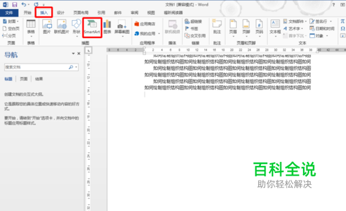 打开Word2013,如在所要编辑的文档的光标处插入组织结构图,需要依次点击“插入”->"SmartArt"