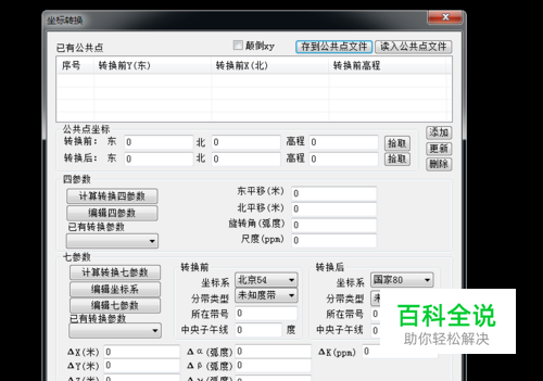 在求参数开始工作前,收集到含有北京54坐标系和西安80坐标系的公共点,最少要有两个以上公共点才可以。