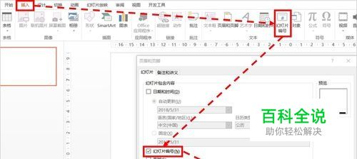 插入编号的步骤是: 1.点击"插入"菜单>" 幻灯片编号" 2. 勾选"幻灯片编号",点击"全部应用"。
