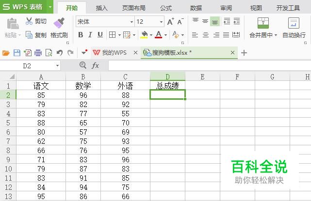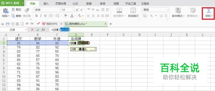 给第一行数据进行求和,单击D2单元格,在菜单栏公式下面选择自动求和,回车
