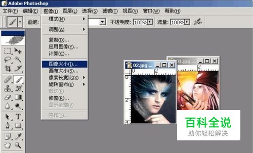 弹出修改框,修改宽度和高度的像素。注意下面红线里的约束比例!要改成非比例的大小就把勾点去!然后将两副图片的大小调一致!