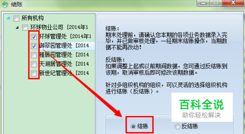 1、打开结账界面后,左边会列出当前权限所拥有的组织,针对当前需要结账或反结账的项目,把前面的勾打上; 注: 系统默认进来全部勾上,如不是全部都统一结账,需人为去把前面的勾去掉。 2、在结账时,我们通常为了与账务账期一致,极致系统的结账应与财务系统的账期保持一致; 3、在结账到下一期前要确认本期已录入的所有收入、收款等单据是否已审核,如存在未审核数据,结账时,系统会有针对存在未审核的单据的组织txt文档提示,根据提示去一览表中把对应单据确认进行审核或把错误单据删除后(如提示“[现金收款单]未完全审核”,可去现金收款单一览表找对应未审核的记录),全部确认都已审核了的再重新进行结账;