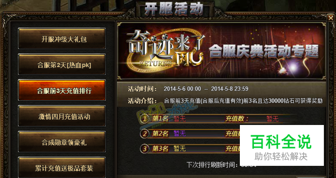 奇迹来了合服活动再次进行了优化,很多更能都很受玩家的认可和欢迎,就比如之前充值排行榜送的顶级大天使武器限时30天改成了永久的,玩家花同样的金钱获得了永久的顶级武器,简直超值到爆!下面就详细介绍奇迹来了如何获得三属性永久的卓越大天使武器。 活动时间:合服后前三天 活动范围:进行合服的区服 活动内容:合服前3天充值(合服后充值有效)前3名且达30000钻石可获得奖励 第一名:三属性卓越大天使之剑/大天使之杖/大天使之弩*1 第二名:+13三属性卓越大天使之剑/大天使之杖/大天使之弩(30天)*1 第三名:+13三属性卓越大天使之剑/大天使之杖/大天使之弩(15天)*1 奇迹来了如何获得三属性永久的卓越大天使武器,小编今天就为大家详细介绍到这里。这武器实在太牛X了,赶紧来奇迹来了游戏中体验吧~