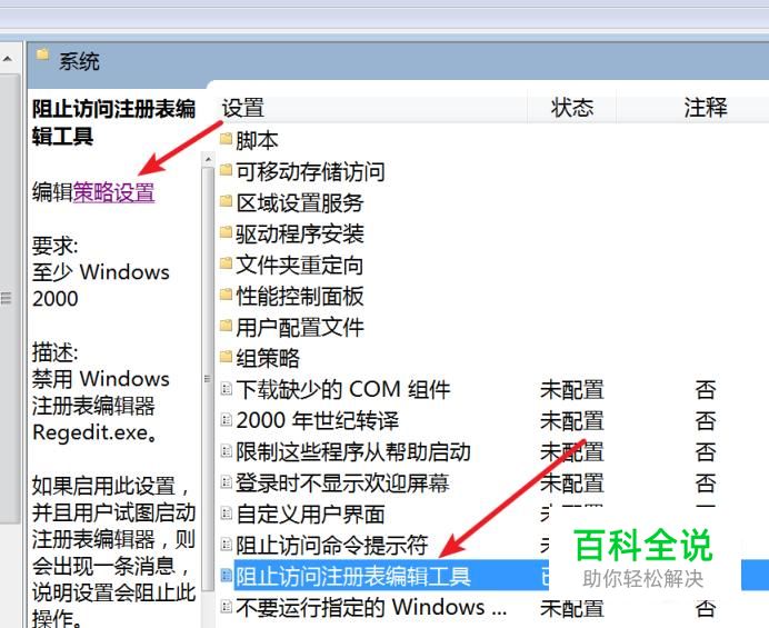 打开后,在右边可看到阻止访问注册表的选项被启用,我们点击左上角的‘编辑策略设置’
