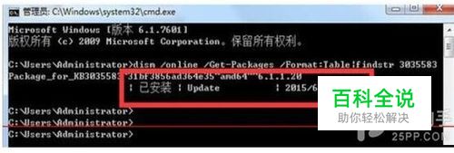 打开管理员模式的命令提示符,输入如下命令:dism /online /Get-Packages /Format:Table|findstr 3035583 并按回车。