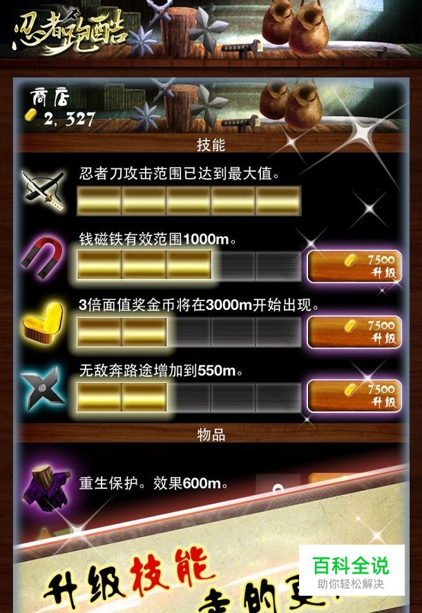 《忍者跑酷》是IOS平台非常热血的“暴力”跑酷类游戏,说其“暴力”,是因为它在跑酷类游戏中首度引入“击杀”概念。游戏的规则很简单,除了可以躲开迎面而来的陷阱和敌人,还可以选择将敌人斩落马下,简单暴力的玩法,让玩家体验非一般的跑酷乐趣。 除此之外,游戏还为玩家准备了极具江户时代特色的技能道具,可以让玩家在游戏中变得更加强大,玩起来也更爽。下面就为大家介绍各种道具的用途以及特点,希望能帮到各位玩家朋友们。 【忍者刀:料敌先机杀人无形】 忍者刀能有效增加角色的攻击范围,能够在敌人接触自身之前就将其斩落马下,可以这么说,忍者刀的等级决定了玩家的攻击力。等级越高,攻击范围越广,自身也就越安全。 【吸钱磁铁:不可或缺的赚钱利器】 金币在游戏中的重要性不言而喻,通过金币升级技能、购买道具,可以让自己变得更强,轻松获得更高的分数。所以增加吸钱磁铁的有效距离,不仅可以赚钱更轻松,更能轻而易举的提高玩家的整体实力。 【金币奖励:让赚钱更轻松】 游戏中的金币分为两种:普通金币和高价值金币,金币奖励可以让高价值金币出现的更早,让玩家赢在起点,轻轻松松提高自身的实力。 【手里剑:人挡杀人佛当弑佛】 手里剑是江户时代,忍者专属的杀人利器,在《忍者跑酷》中,手里剑演变成无敌模式,只需要开启“手里剑”,无论陷阱还是敌人,都不能对自己造成任何伤害。提升手里剑等级,更是可以增加手里剑道具无敌效果的持续距离,让游戏更暴力更爽快! 在游戏中,道具的强化也十分简单,只需要进入“商店”,点击需要强化的技能即可,还不快来体验!