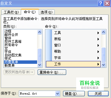 在左边的“类别”下拉列表中选择“内置菜单”项,在右边的“命令”下拉列表中选择“工作”项,然后将此选项通过鼠标拖曳到菜单栏上。关闭自定义对话框,保存Word文档。