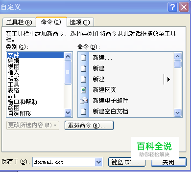 打开Word 2003文档,然后打开“工具”菜单中的“自定义”命令,在弹出的“自定义”对话框中,点击“命令”选项卡。