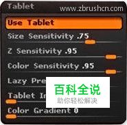数位板在ZBrush中的调节使用 通常情况下,我们只需要正确安装了数位板的驱动程序就可以直接在ZBrush中使用了,ZBrush对各种品牌的数位板支持都不错,默认设置下就可以识别并且使用压感笔雕刻。 但是对于一些经常使用个性设定的朋友,默认的设置肯定是不够的,我们也可以通过调节Preference菜单下的Tablet子面板来定制自己的数位板设置,如图所示。
