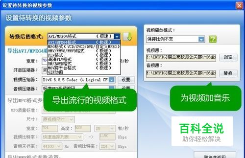 设置导出的视频格式以及视频参数 添加进视频后,接着进入“设置待转换的视频参数”对话框,在“转换后的格式”的下拉框中选择GIF格式。如果你想为视频添加好听的背景音乐,那可以点击该界面右侧“音频源”处的“替换”按钮,替换原视频的音频文件,为视频添加音频的。