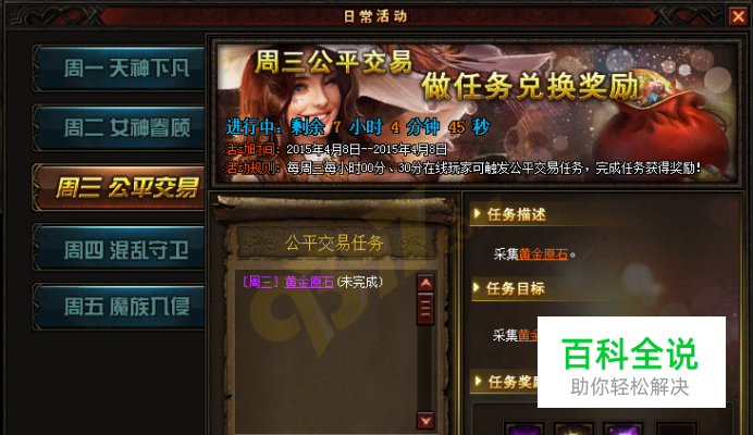 公平交易,就是指公平合理的买卖。在9377奇迹来了游戏中,有一种任务叫做公平交易任务,只要你能完成该任务,就能获得相应的奖励,绝对的公平合理。但公平交易任务只有在固定时间内才能触发,那么奇迹来了公平交易任务在哪接呢? 奇迹来了公平交易任务只有在每周三才能接取,而且只有在每小时的00分、30分的在线玩家才可触发该任务,因此在线的玩家每隔半个钟就需点进日常活动中查看,是否已经触发了公平交易任务。 每个玩家每天可接取10次公平交易任务,每30分钟发布任务。若触发任务后未接取,可累计任务,最高可累计5次。该任务与奇迹来了日常任务、战盟任务等跑环任务类似,任务目标都是多样的,如采集黄金原石5个,击退暗黑防御者50只等等。玩家只需点击任务目标后的小飞鞋图标,即可立即到达目标处,采集物品或击杀怪物即可完成该完成。 公平交易任务由NPC小羊发布,它位于勇者大陆左边,NPC法师导师(任务)的旁边。它的外形就是一只呆萌可爱的小羊,是的,你没看错,就是一只小羊,只要与之对话就能接取任务。若未触发任务,与之对话,它就只能对你咩~咩~咩~咩~ 完成奇迹来了公平交易任务可获得546W经验值、41.3W金币和2000魔魂奖励,若想拿到更多奖励,可以花费10钻石激活双倍奖励。若你觉得任务太难,不想做,也可选择放弃任务,但放弃了可就没有奖励了哦!因此,你还可以花费10钻石来快速完成任务,直接拿奖励!