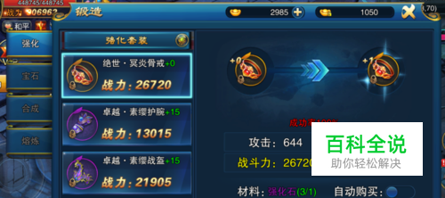 玩家通过使用强化石,可以强化装备,装备强化等级越高,所加成的人物角色属性越高; 装备强化等级越高,强化成功率越低。