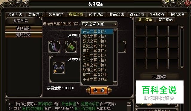 《烈火战神》是一大型即时角色扮演型网页游戏,游戏实现了以网页构架形式展现海量用户同场景的游戏互动;相比目前上市的其他ARPG类游戏在游戏玩法上独树一帜,采用丰富活动玩法和经典剧情副本相结合的模式,《烈火战神》游戏画面力求营造出逼真写实的场景视觉效果,写实优美的魔幻世界和流畅的画面给玩家带来不一样的游戏体验。下面为大家简单介绍一下,如何去合成翅膀。