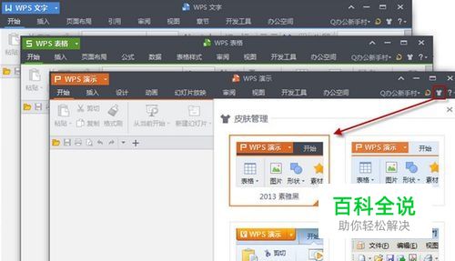 全新界面、全新设计 全新2013界面皮肤 皮肤随心换,空间布局更合理 功能入口: 启动WPS任意组件 2013/2012风格下,点击程序右上角“更改界面”图标 经典风格下:点击常用工具栏上“更改界面”图标