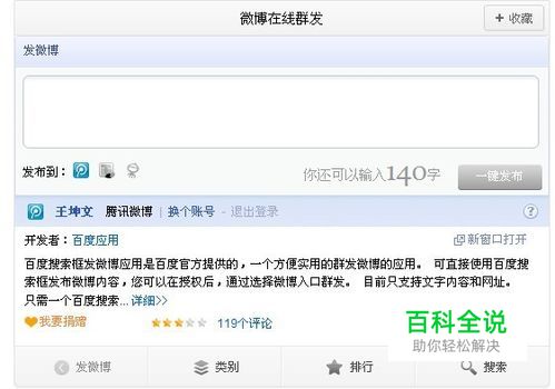百度搜索框发微博应用是百度官方提供的,一个方便实用的群发微博的应用。可直接使用百度搜索框发布微博内容,您可以在授权后,通过选择微博入口群发。目前只支持文字内容和网址。