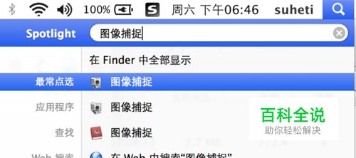 点开电脑屏幕右上角的放大镜(Spotlight 功能),输入“图像捕捉” (或英文Image Capture),打开搜索结果中的该程序。