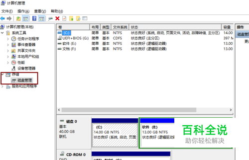打开“计算机管理”界面点击存储的“磁盘管理”项;