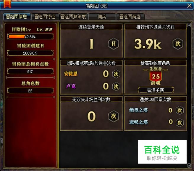 在冒险团信息一览,可以看到冒险团等级,以及冒险团升级的经验条,将鼠标移动至经验条,还可以看到冒险团升级所需要的经验。