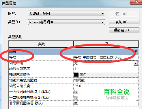 2、选择轴网,然后编辑类型,在类型属性对话框里面查看下轴网的符号。