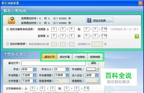 电影导入后,直到进入“其它功能设置”界面,如下图第一个绿色选框所示,你可以看到你的电影的总时间,设置好裁剪的开始时间和结束时间就能对电影文件进行裁剪了,而且软件设定的时间精确度高~ 我们也可以给电影文件添加上个性标志(叠加文字、滚动字幕、个性商标、视频相框),根据自己的需要选择下图第二个绿色选框里面的个性标志进行添加即可! 这里以添加视频相框为例子,选择“视频相框”选项卡,然后点击下图标签2-“浏览”按钮就能选择你喜欢的相框类型,还能轻松设置相框持续出现的时间以及透明度~