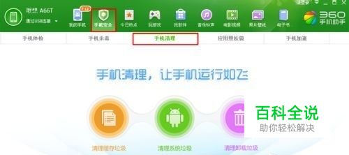 第一步:用数据线把手机和电脑连接起来。再通过360手机助手来管理手机。然后选择管理界面的【手机安全】模块