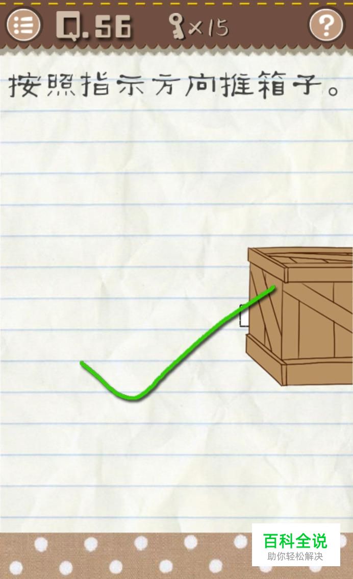 第56关:要求是按照指示方向推箱子。熟悉最囧游戏套路的小伙儿伴们儿都知道它喜欢钻字眼儿,所以在这一关里钻的字眼就是“推”啦,注意要模拟推的动作哦