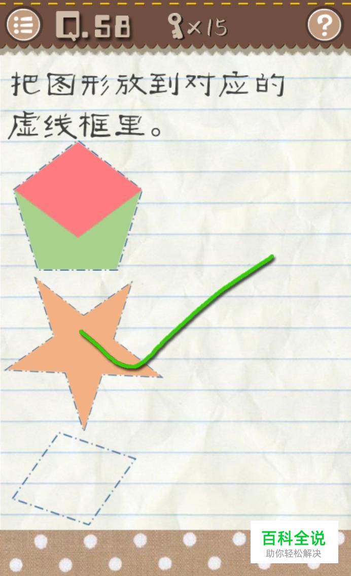 第58关:要求是把图形放到对应的虚线框里。由图可以看出,菱形不能放进给出的那个菱形的框子,但是菱形可以放五边形虚线内啊
